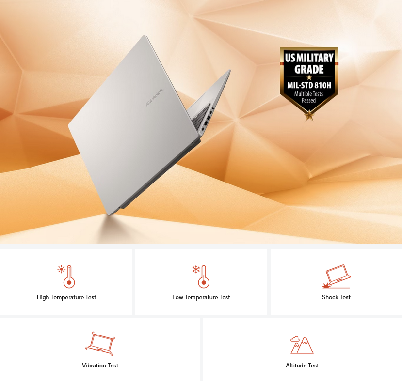 The MIL-STD 810H military standard for reliability and durability, undergoing a punishing test regime that includes extended tests for operation in harsh environments. These factors also help improve the laptops' longevity and sustainability, so you can work, travel or relax with the confidence that your ASUS laptop is ready for the real world - today, and long into the future.
