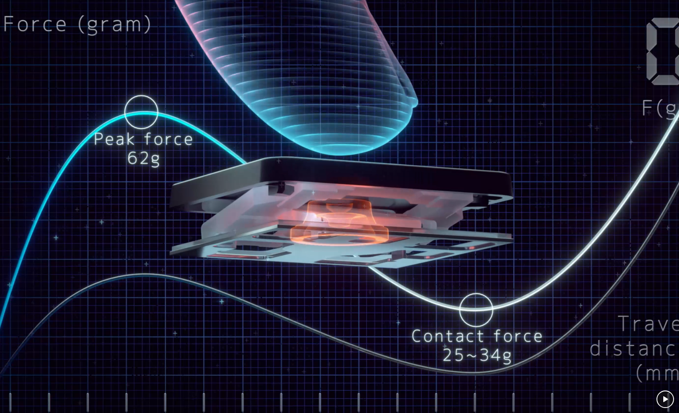 The feel of a keyboard depends on the crucial ratio between the peak force (also known as the actuation force) and the contact force. Peak force occurs when you press down on the key and reach the maximum force that the key’s underlying rubber dome can withstand without deflecting. Contact force occurs when the bottom of the key touches the circuit board to trigger an electronic signal, which in turn generates the action appropriate to the key. To achieve the most natural feel for a keyboard, ASUS keyboard experts have scientifically determined that the optimal ergonomic click ratio for a key is between 45-60%. These forces are precisely measured and tuned using the ASUS-designed rubber domes beneath the keys.