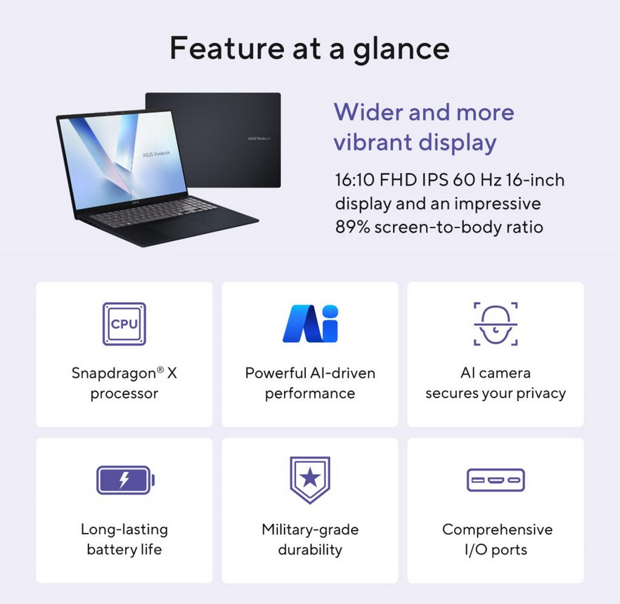 The ASUS Vivobook 16 is your ultimate tool for tackling any task with ease. Equipped with a powerful Snapdragon® X processor, blazing-fast Wi-Fi 6E, 512 GB PCIe® 4.0 SSD, and an impressive 16 GB of high-speed 8448 MHz LPDDR5X memory, you’ll enjoy exceptional performance and ample storage for everything you need.