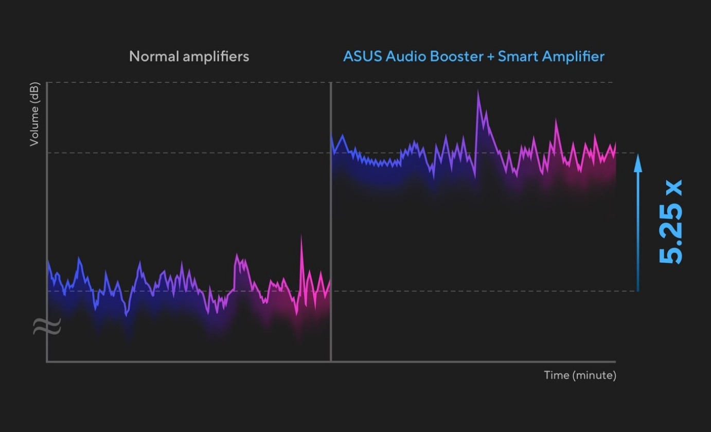 Combining a Smart Amplifier and ASUS Audio Booster technology, the audio volume is boosted by up to 5.25X for a powerful audio experience.