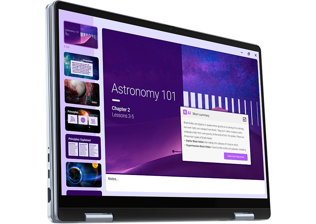 Effortlessly switch between four modes, including a full 360, with all the essentials included. Enjoy vivid colors and sharp details on a spacious 14" FHD+ touch screen, keep your eyes comfortable with Dell ComfortView and enjoy your favorite content even in crowded environments with loud and clear speakerphone-grade audio. With a supported Dell Active Pen, interact intuitively with a touch screen and write and draw naturally.