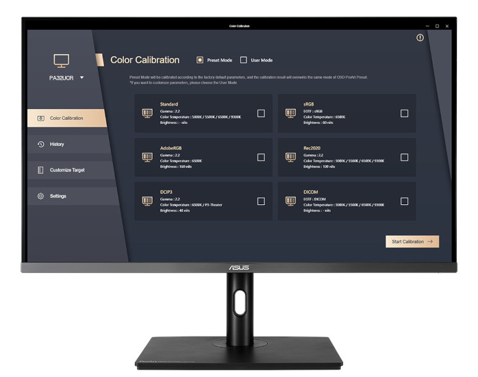 Integrated ASUS ProArt Calibration 2.0 enables swift and easy adjustments to maintain the color accuracy of ASUS ProArt monitors. It offers SDR and HDR calibration with adjustable brightness, color gamut, color temperature and other parameters to ensure consistent and precise colors. Additionally, ProArt Calibration 2.0 can re-calibrate each color gamut mode and write back into each ProArt Preset mode