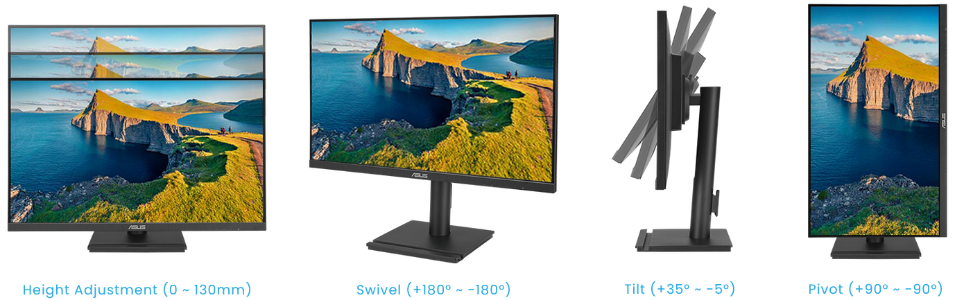 Flexible tilt, swivel, pivot and height adjustments make it easy to find the most comfortable viewing position. The screen can also be rotated a full 90° into a portrait orientation, which is ideal for working with long documents, writing code or browsing websites.