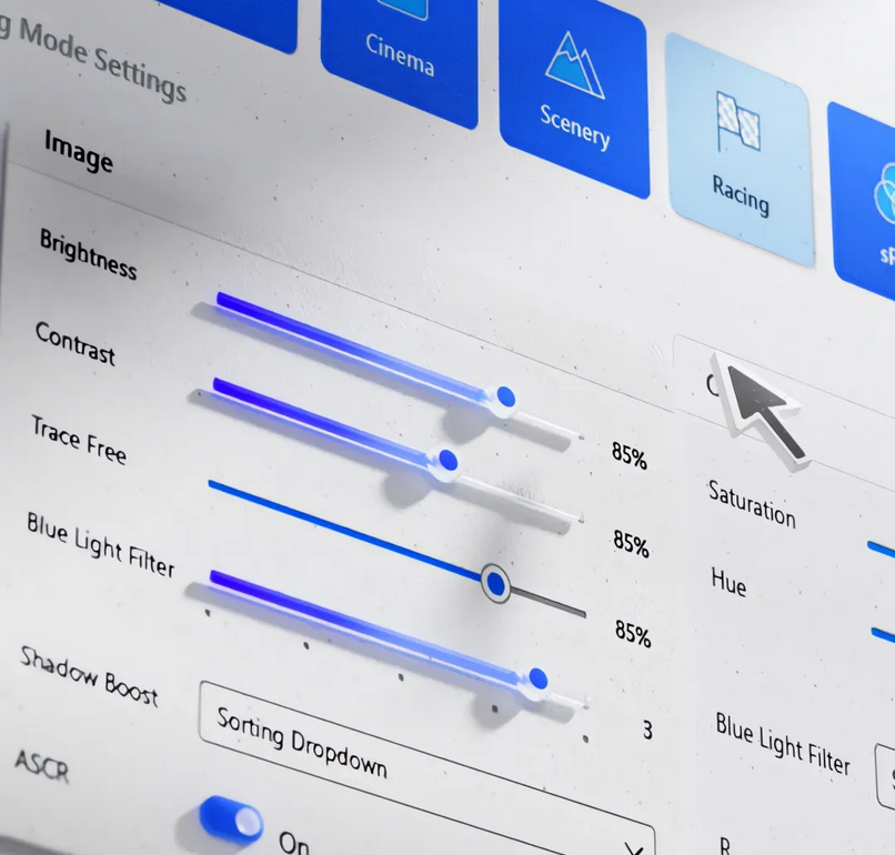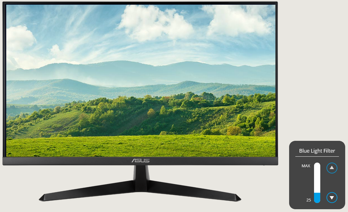 An integrated TÜV Rheinland-certified ASUS Blue Light Filter protects eyes from harmful blue light. Settings can be quickly accessed via the onscreen display (OSD) menu, and an intuitive slider makes it easy to adjust filter levels to suit any scenario or user preference.