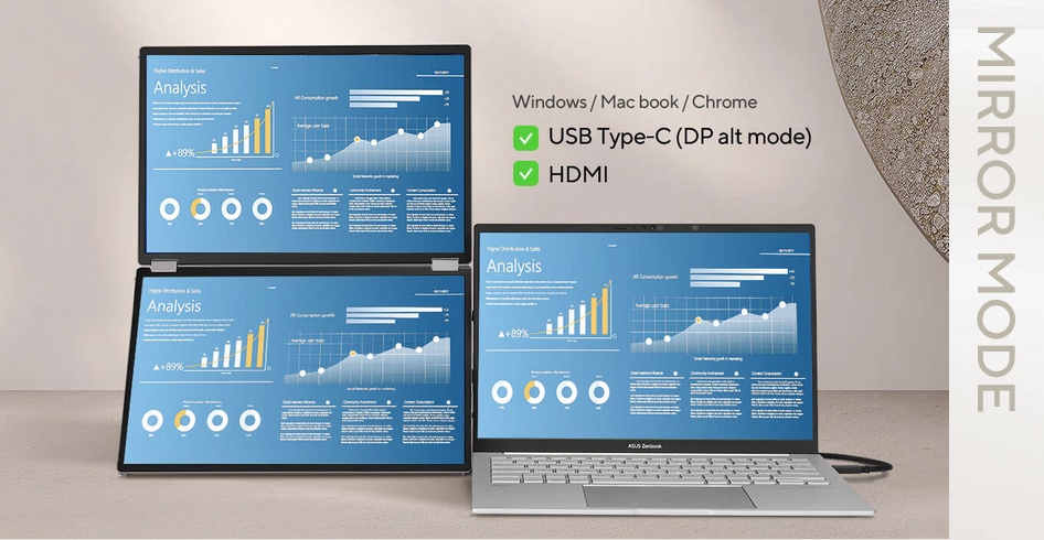 MQ149CD dual screen provides various user scenarios that can be easily enabled via OSD control, offering hassle-free multi-screen setups. These include Independent mode, Extend mode, Mirror mode, and Split mode.