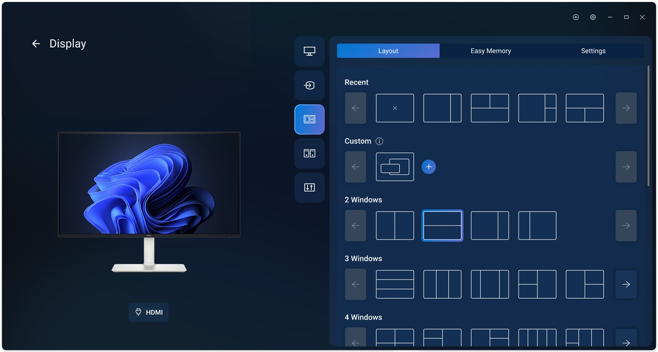Easy Arrange tiles apps across screens with pre-set partitions and customises up to five windows, enhancing multitasking. Easy Arrange Memory saves and restores app profiles manually, on schedule, or at start-up.