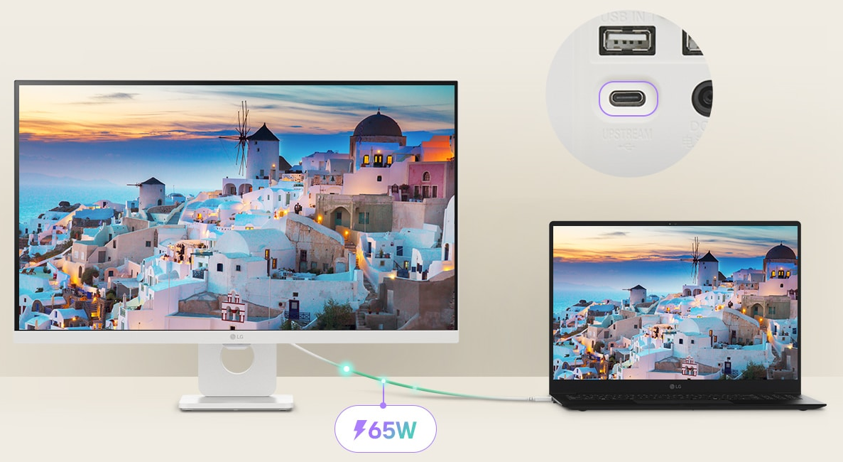 USB-C port allows from display and data transferring to connected device charging (up to 65W), enabling support for your laptop, all at the same time over a single cable.