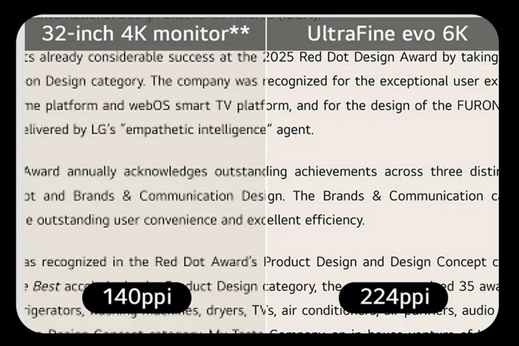 With 6K resolution (6144 x 3456) and a razor-sharp 224 PPI, the LG UltraFine evo packs over 21 million pixels into a 32" panel - delivering 156% more pixels than standard 4K. UltraFine evo has has more working pixels in every inch—allowing you to view full-resolution content while keeping creative tools and editing interfaces clearly visible, sharp, and distortion-free.