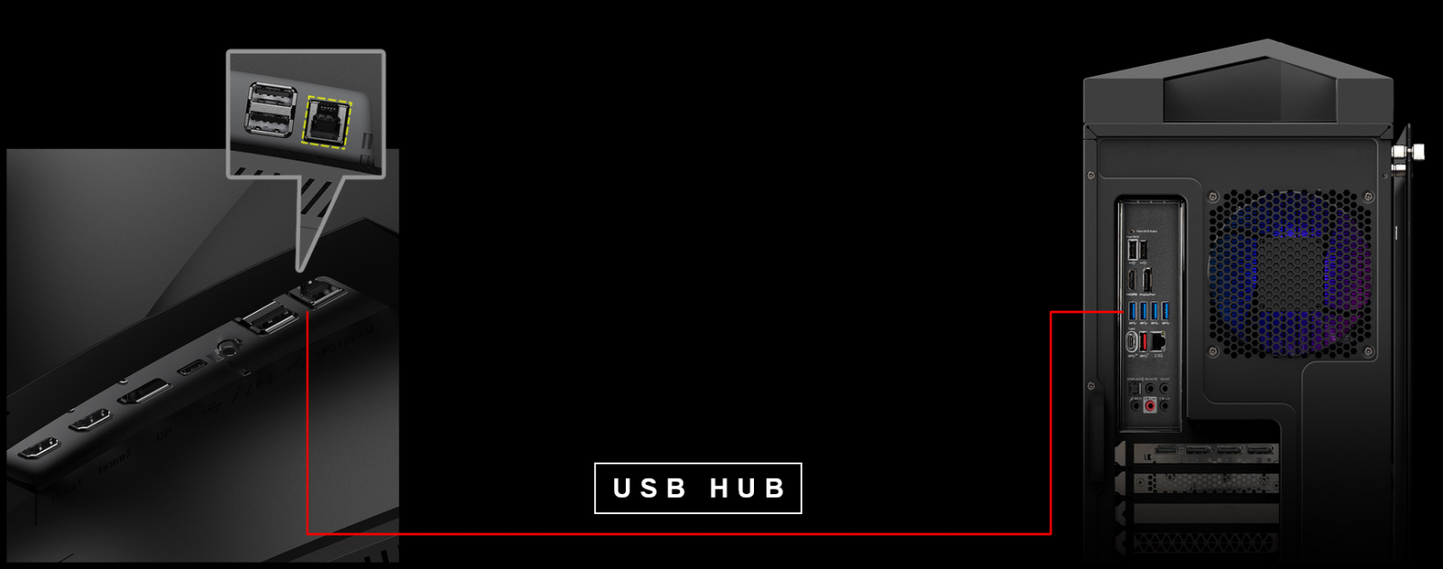 To activate additional USB ports and allow the mouse to be available for use on the GAMING OSD APP, don't forget to connect the monitor and your PC by the USB cable which you can find in the product accessory box. Enjoy the convenience of having extra ports and intuitive adjustment of the monitor settings with the mouse.
