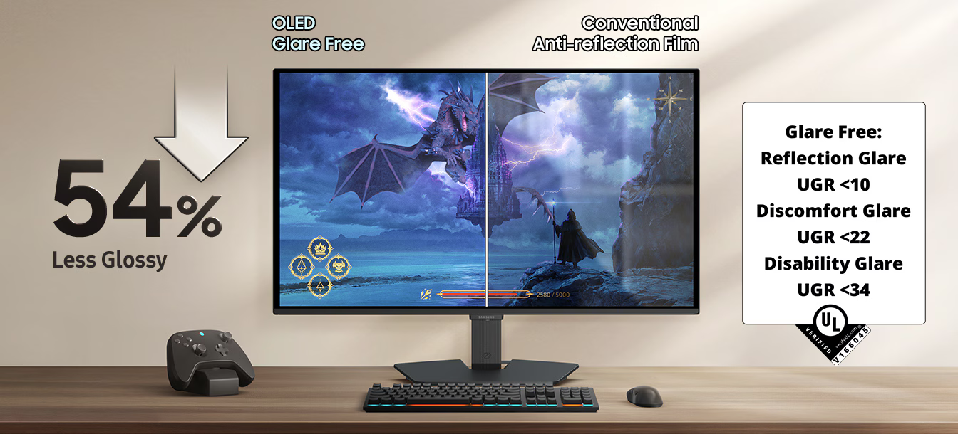 Keep playing uninterrupted with Glare Free technology. Samsung's Glare Free film is 54% less glossy than conventional Anti Reflection film, keeping the screen clear of reflections from external light sources. Now you can get the drop on your enemies even when daylight is streaming in.