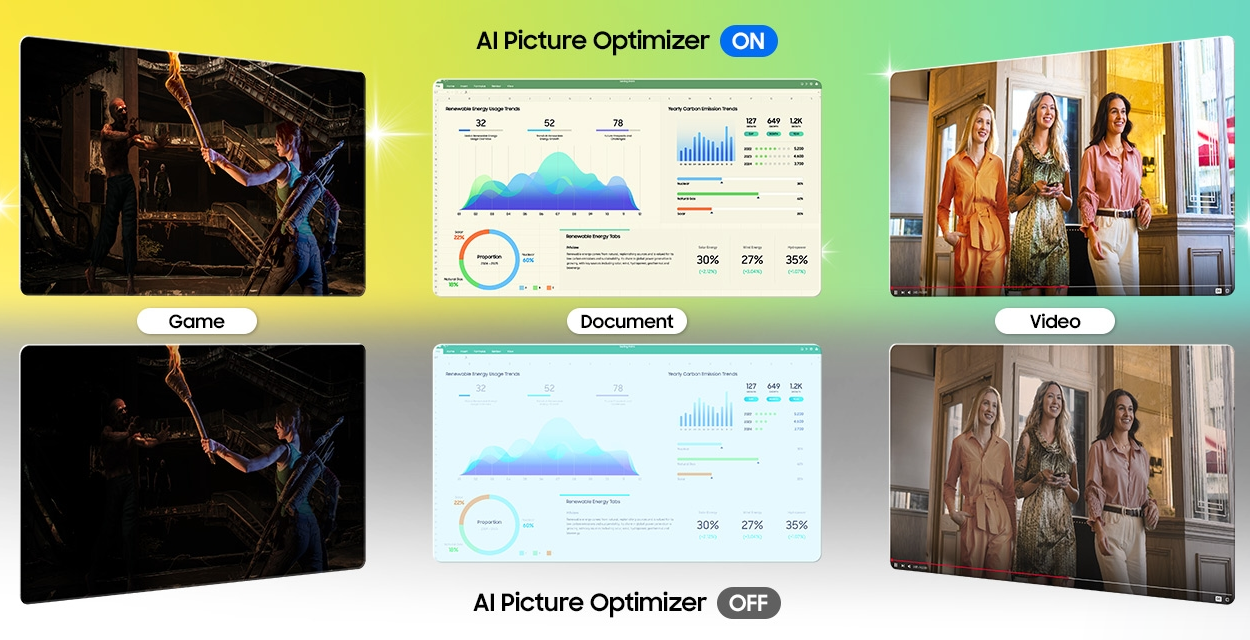 Experience optimal picture quality adjusted to your needs. AI Picture Optimizer adapts the visuals to help you work on documents with comfort, get fully immersed in games with deep, rich blacks and watch videos in vibrant colors.