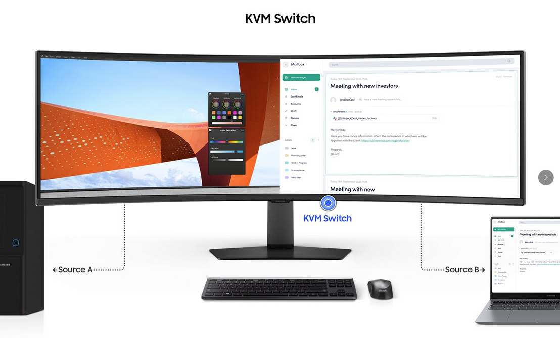 Remove multi-device hassle with easy input switching. The built-in KVM switch lets you connect and control two sources at once with just one keyboard and mouse.
