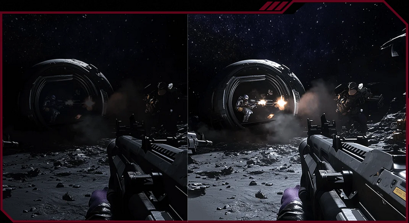 With a peak brightness of 2000nits and dark detail reproduction down to 0.0001 nits, HDR1000 delivers deep darks and bright highlights. Game visuals are clearer with striking HDR brightness and lifelike depth.