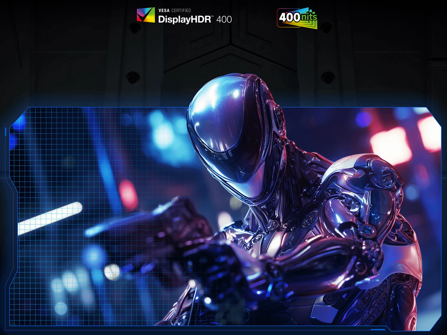 HDR 400 expands the brightness range for clearer dark details and more lifelike highlights. At 400 nits brightness, highlights stay controlled and shadows are clear, revealing every in-game detail.
