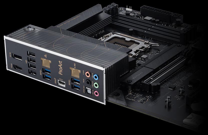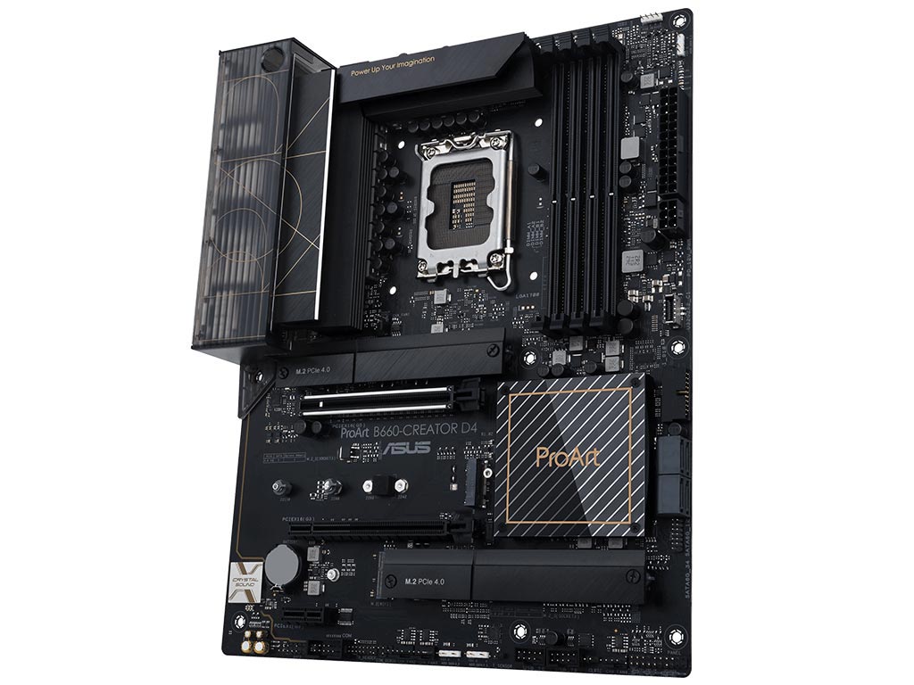 ProArt B660-Creator D4 is an enhanced motherboard designed for intensive content-creation workloads like 3D rendering and 4K/8K video editing. It unleashes the performance of 12th Gen Intel® Core™ processors through robust power delivery and cooling design, and its comprehensive connectivity includes onboard 2.5 Gb and 1 Gb Ethernet, a USB 3.2 Gen 2x2 Type-C® front-panel connector with Quick Charge 4+, and DisplayPort™ via USB-C.
