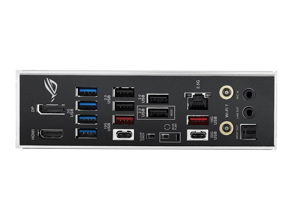 | Back Panel I/O Ports | 1x USB 20Gbps port (1 x USB Type-C®) 3 x USB 10Gbps ports (2 x Type-A + 1 x USB Type-C®) 4 x USB 5Gbps ports (4 x Type-A) 4 x USB 2.0 ports (4 x Type-A) 1 x DisplayPort 1 x HDMI™ port 1 x Wi-Fi module 1 x Intel® 2.5Gb Ethernet port 2 x Audio jacks 1 x Optical S/PDIF out port 1 x BIOS FlashBack™ button 1 x Clear CMOS button |
