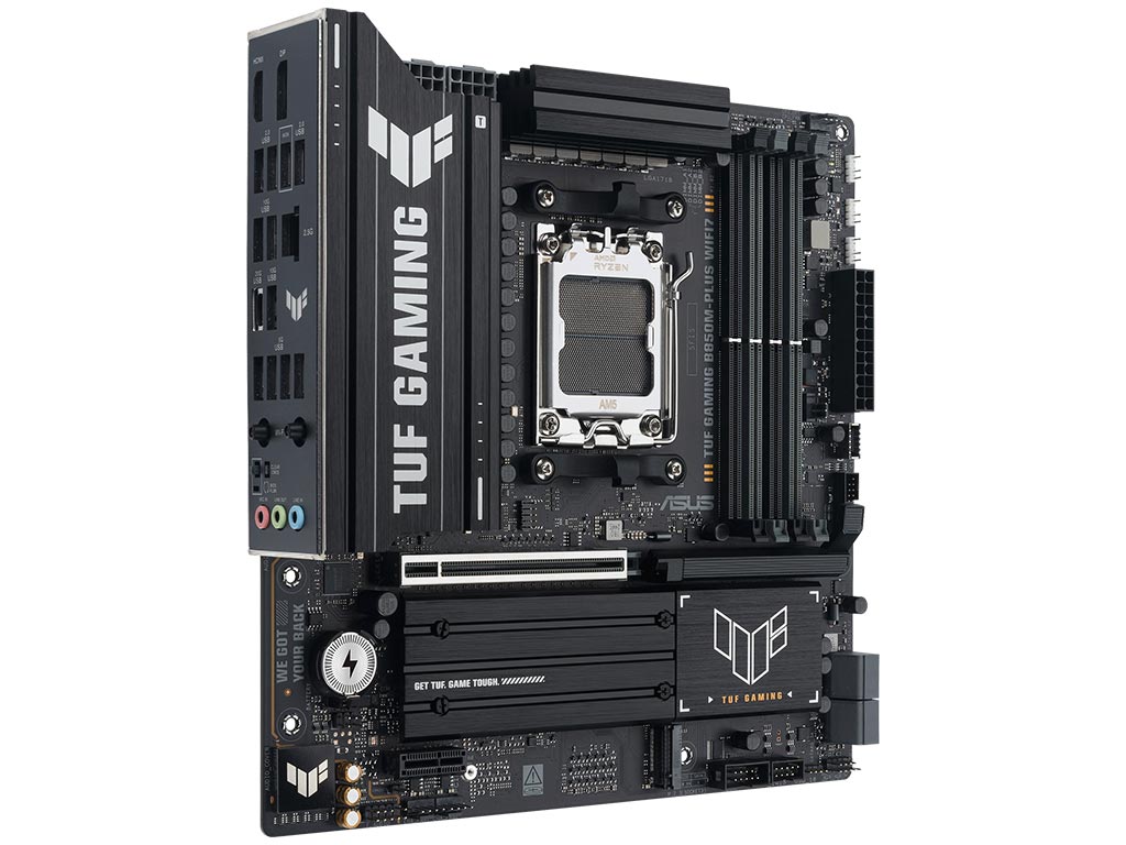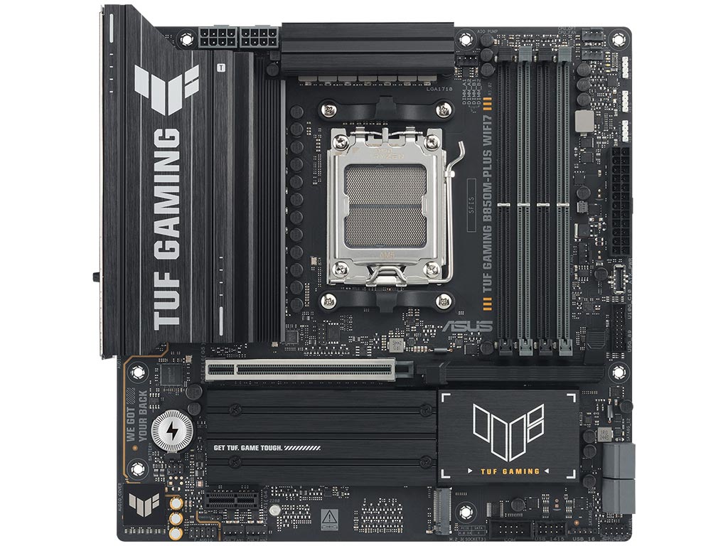 TUF GAMING B850M-PLUS WIFI7 takes all the essential elements of the latest AMD Ryzen™ processors and combines them with game-ready features and proven durability. Engineered with military-grade components, an upgraded power solution and a comprehensive cooling system, this motherboard goes beyond expectations with rock-solid and stable performance for marathon gaming. TUF GAMING motherboards also undergo rigorous endurance testing to ensure that they can handle conditions where others may fail. This platform delivers the power and connectivity that advanced AI PC applications demand.