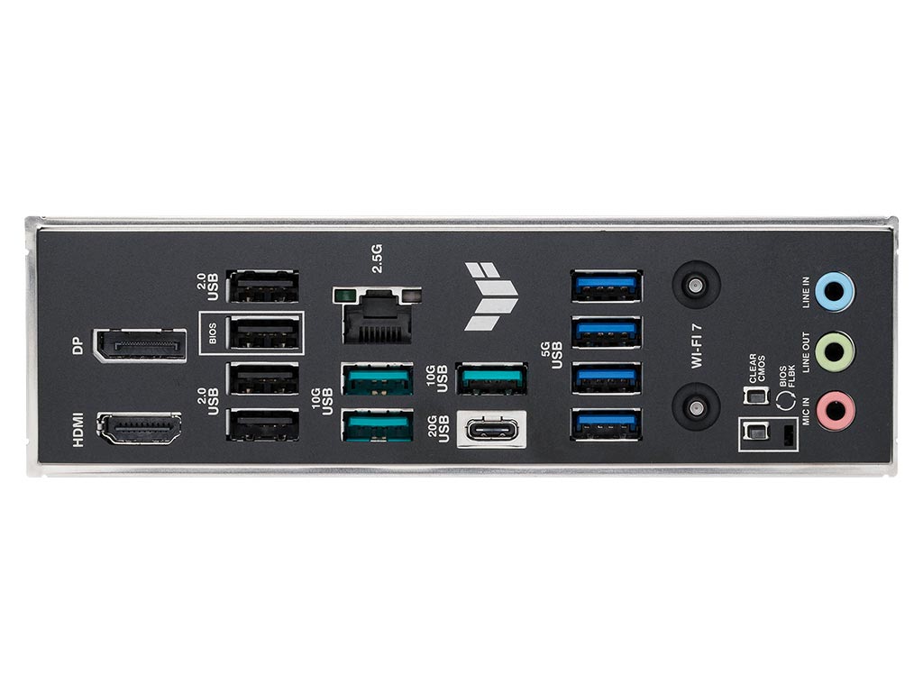 | Back Panel I/O Ports | 1 x USB 20Gbps port (1 x USB Type-C®) 3 x USB 10Gbps ports (3 x Type-A) 4 x USB 5Gbps ports (4 x Type-A) 4 x USB 2.0 ports (4 x Type-A) 1 x DisplayPort 1 x HDMI™ port 1 x Wi-Fi module 1 x Realtek 2.5Gb Ethernet port 3 x Audio jacks 1 x BIOS FlashBack™ button 1 x Clear CMOS button |