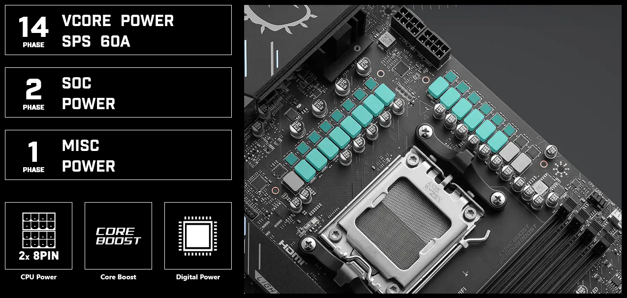 Unleash and sustain maximum performance with a flagship VRM design built with a total of 14+2+1 digital power phases. Combining dual power connectors and 60A Smart Power Stage, X870 GAMING PLUS WIFI is ready for the challenge of high-end processors.