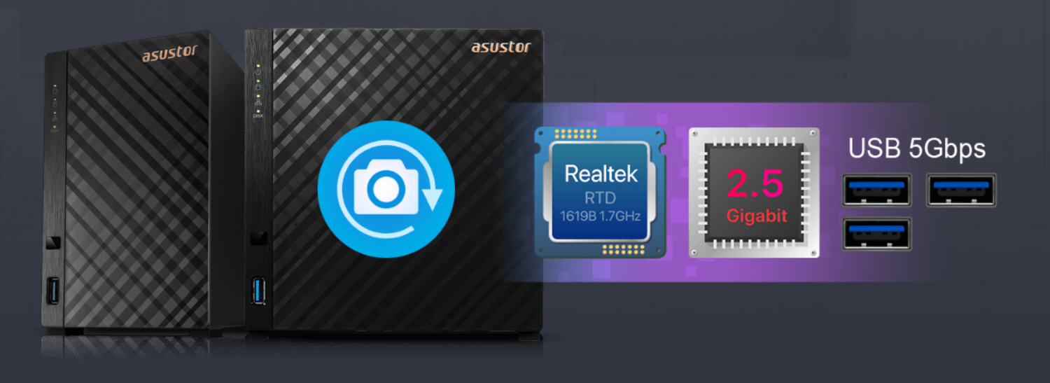 The AS12 series is designed for families: offering ample storage, secure backups, and ease of use. Powered by a Realtek RTD1619B 1.7 GHz Quad-Core processor, it features 2.5GbE networking and supports Btrfs snapshots for extra data protection. With three USB 5Gbps ports (1 front, 2 rear), you have more flexibility for external backups and peripheral expansion.