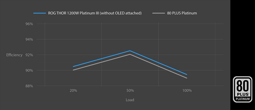 The ROG Thor 1200W Platinum III utilizes low-ESR Japanese capacitors to ensure efficient operation. These upgrades enable 80 PLUS Platinum certification, which guarantees 89% efficiency at 100% load and 92% efficiency at 50% load. The increased efficiency results in less heat, reduced fan noise, and increased reliability.
