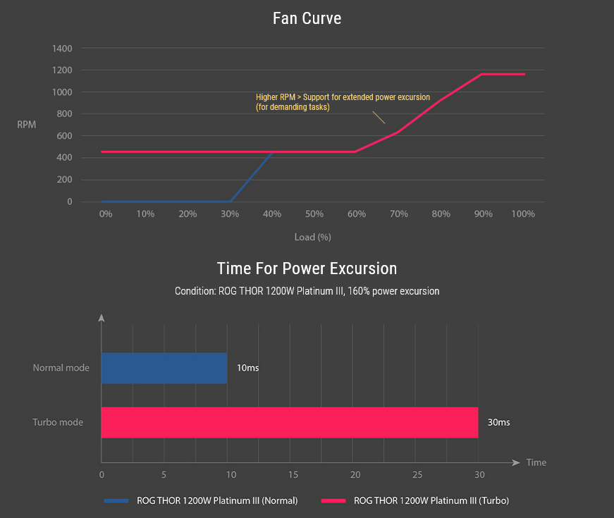 Turbo Mode unlocks support for extended power excursions, courtesy of a fine-tuned fan curve and premium components. Enjoy unwavering performance when you need it most, and switch between peak performance and ultimate silence with just a press of the Turbo Mode button on the rear of the PSU.