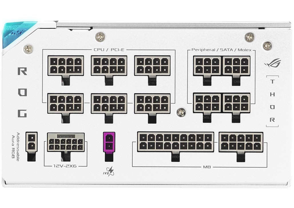 The ROG Thor 1200W Platinum III White Edition has addressable Aura RGB LEDs built in, ready to accent an Aura-compatible rig with an array of colors and lighting effects. Users of Aura-sync compatible ASUS and ROG graphics cards can also enjoy Smart Mode, a lighting effect that changes color according to GPU temperature.