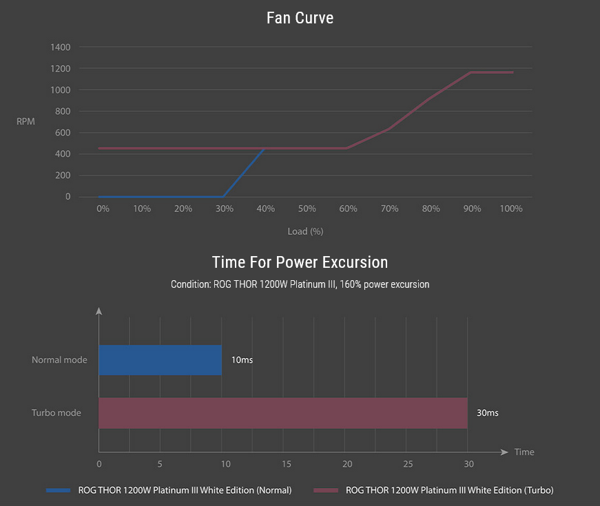 Turbo Mode unlocks support for extended power excursions, courtesy of a fine-tuned fan curve and premium components. Enjoy unwavering performance when you need it most, and switch between peak performance and ultimate silence with just a press of the Turbo Mode button on the rear of the PSU.