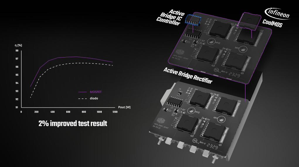 The Active Bridge Rectifier, equipped with the Infineon CoolMOS, marks a significant advancement in power efficiency. This innovative combination not only conserves electricity, but also significantly reduces power loss, outperforming traditional bridge diodes. It's an ideal solution for users seeking eco-friendly, high-efficiency power supply units.