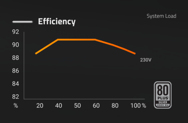 The 80 Plus Silver certification (230V EU) guarantees a 90% efficiency rate at a 50% load, resulting in reduced power wastage, diminished heat generation, and minimized fan noise.