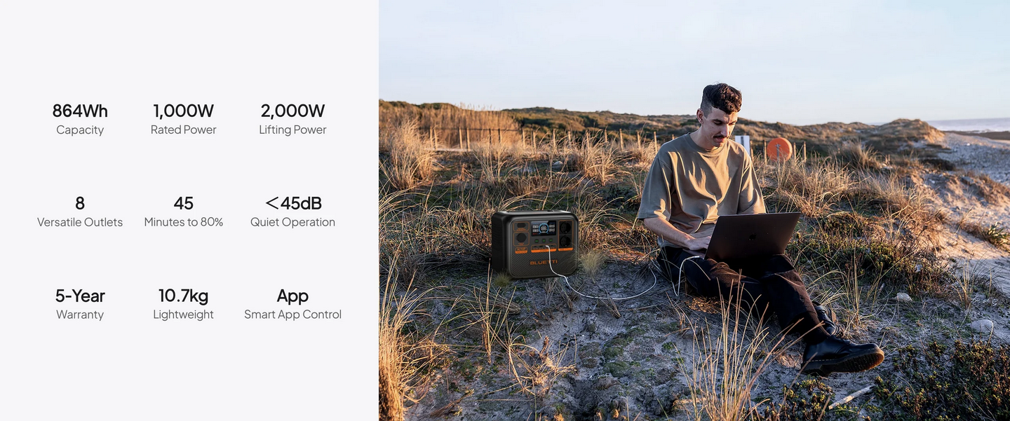 Elevate your on-the-go power solutions with the BLUETTI AC70P Power Station! Boasting a robust 864Wh capacity and a 1.000W continuous power, it effortlessly energizes your essential devices during outdoor adventures, RV escapades, or cozy moments at home. The lightweight and portable design ensures non-stop power is always at your service whenever you need.