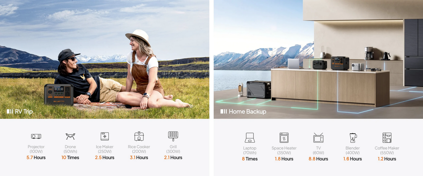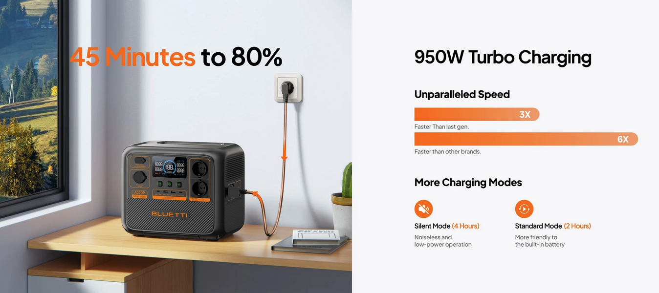 With BLUETTI Turbo Charging Technology, you no longer have to wait a long time to get it charged. The fast charging allows you to replenish it at your last-minute pack-up, ensuring your power is at the ready before you hit the road.
