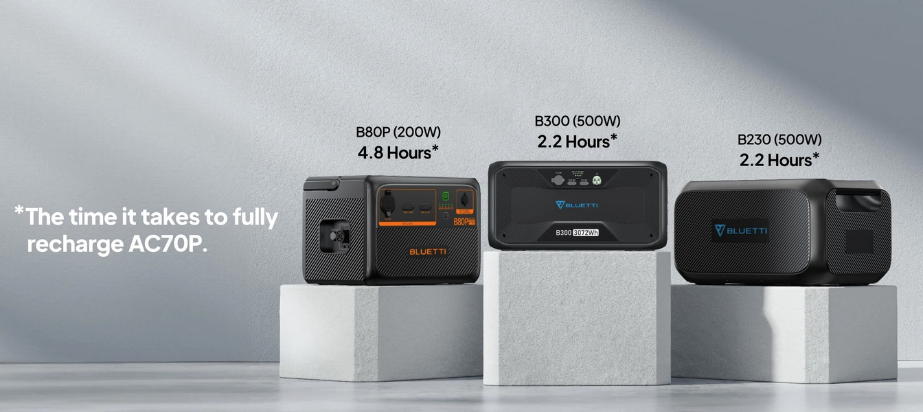 Worry about power running out during your journey? AC70P is compatible with B80P (806Wh), B230 (2.048Wh), and B300 (3.072Wh) for prolonged battery life.
