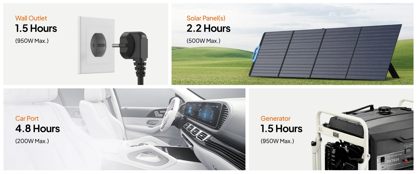 AC70P gives you the freedom to recharge your devices in any way you prefer: wall charging, solar charging, car charging, generator charging, or LiFePO₄ battery charging. Whether you are at home, on the road, or outdoors, you can always find a suitable power source for AC70P.