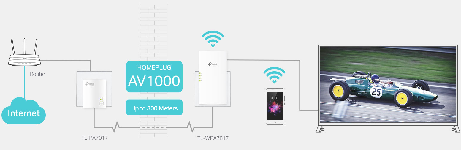 Using advanced HomePlug AV2 technology, TL-WPA7817 KIT ensures stable and high-speed Wi-Fi and wired connection, providing data transmissions of up to 1000 Mbps over the electrical wiring for ranges up to 300 meters. Stream in HD, game online and download large files without interruption thanks to reliable powerline links.