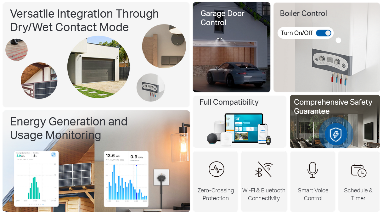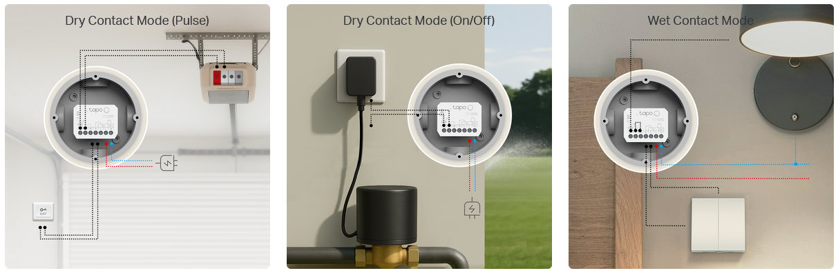 Tapo S110E supports dual modes, ideal for handling a wide range of applications. In dry contact mode, it is perfect for managing garage doors, boilers, irrigation and sprinkler systems, access control systems, and more. In wet contact mode, effortlessly control smart lights, outlets, and electric floor heating without replacing your existing equipment.
