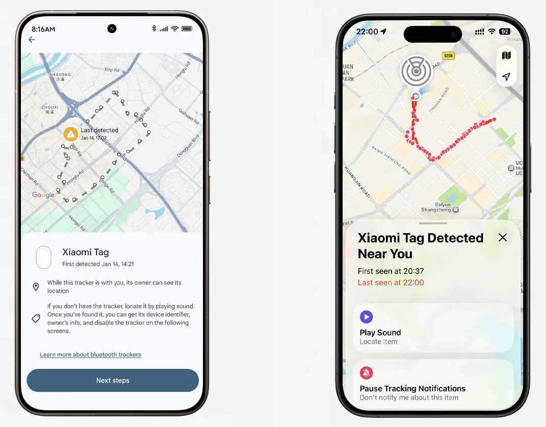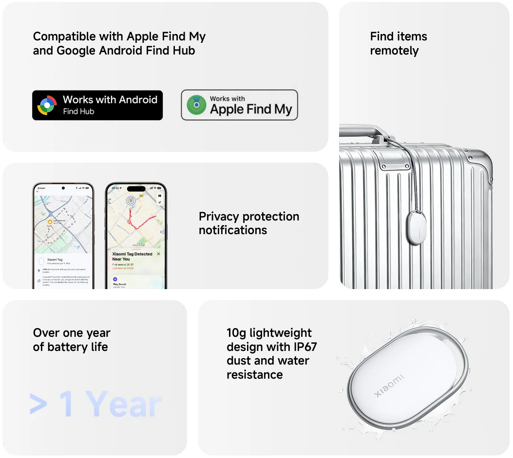 Xiaomi Tag location data is encrypted during transmission, ensuring only you can see its location. If an unknown Tag follows you for an extended period, the system will send an anti-tracking alert.