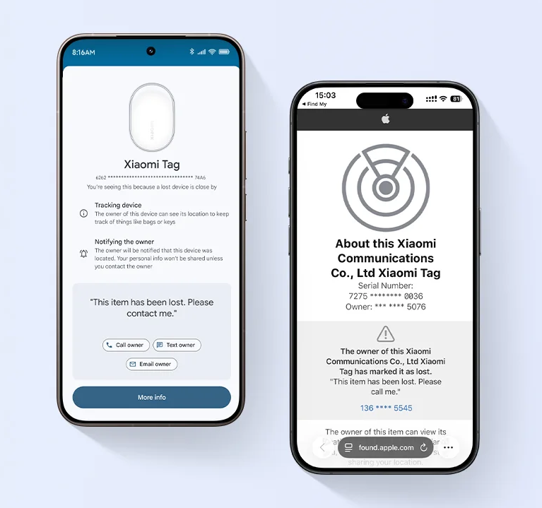 You can mark an item as lost and add the owner's contact details along with a message. If someone finds the item, they can access the owner's contact information.Google Find Hub users: When a Xiaomi Tag is detected nearby, a pop-up will appear with the owner's details. Apple Find My users: Tap the Xiaomi Tag with an NFC-enabled smartphone to view the owner's details.