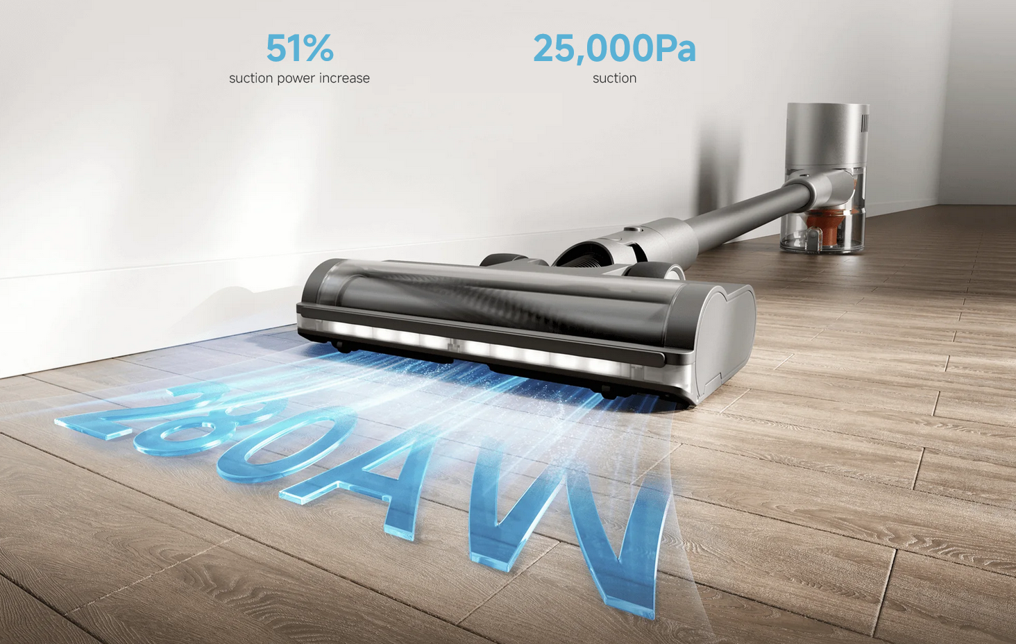 Up to 280AW suction power. Clean dust from crevices and stubborn floor dirt with ease