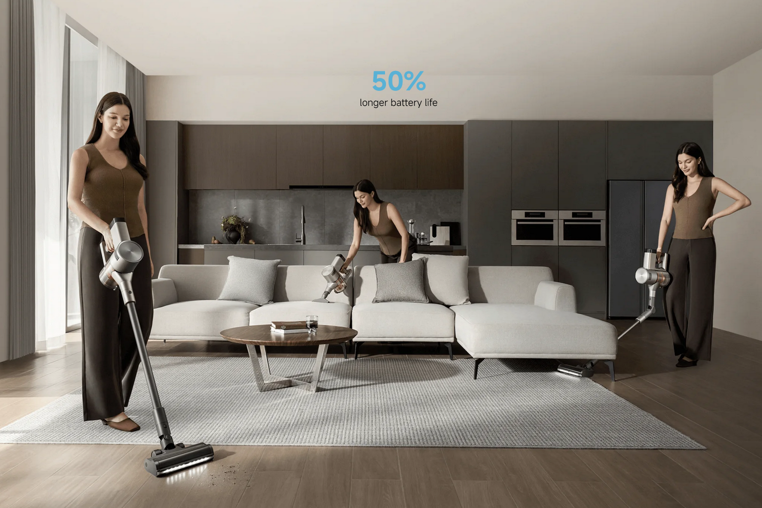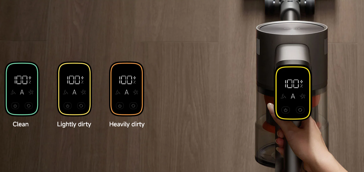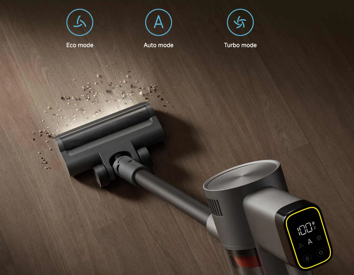 Three modes available. In auto mode, a smart dust sensor automatically adjusts suction power based on ambient dust levels. Real-time detection ensures efficient cleaning, energy savings and extended battery life.