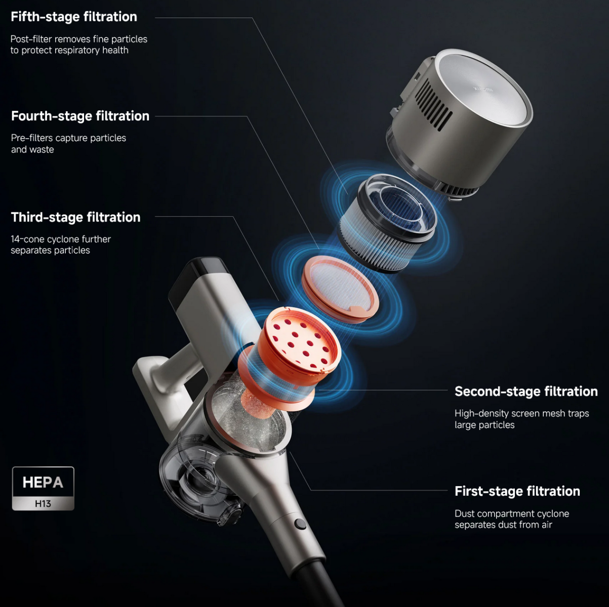 14-cone cyclone dust-separation technology. Efficient dust-air separation for stable, long-lasting strong suction.