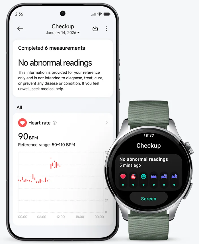 Building on high-precision 4 LEDs + 4 PDs monitoring technology, Xiaomi Watch 5 performs health evaluations and continuously monitors for health risks with a single tap. View detailed health reports and clear, easy-to-understand insights directly in the app.