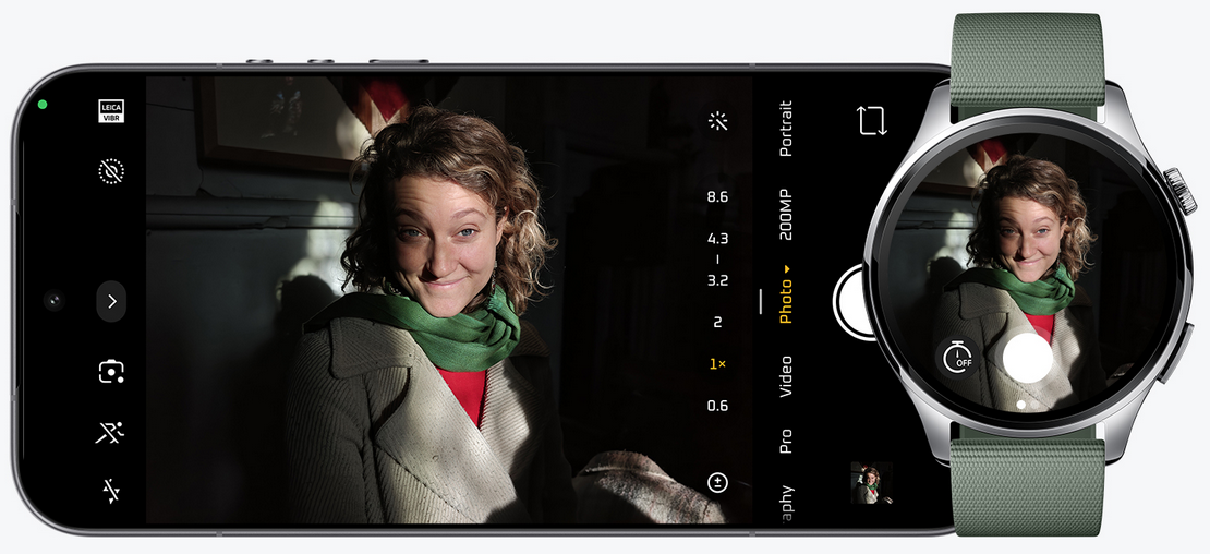 The watch screen can act as a smartphone viewfinder. Even when your smartphone is at a distance, as long as it's connected via Bluetooth, you can effortlessly control your watch to take photos and videos.
