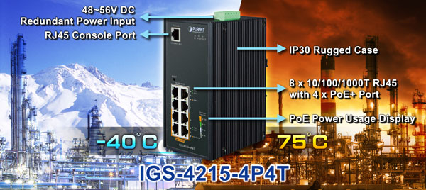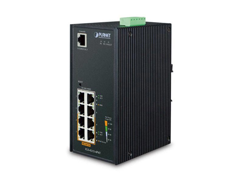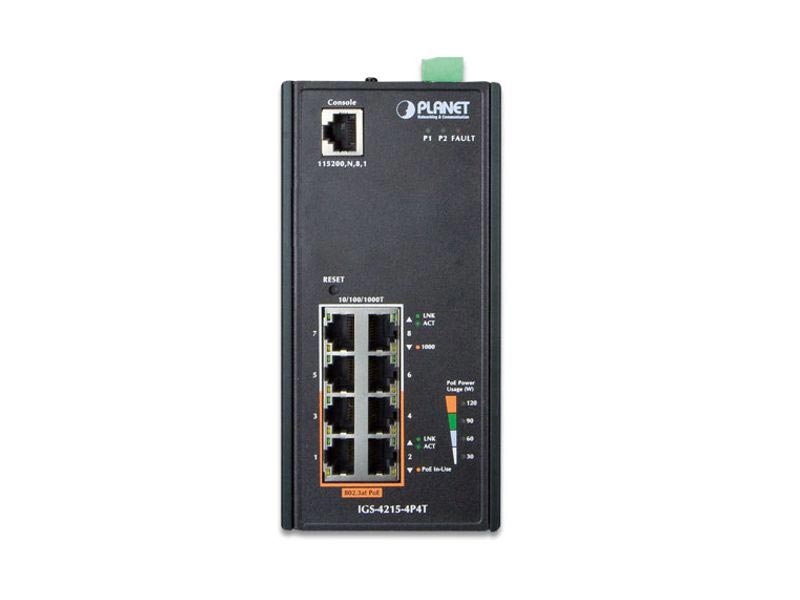Designed to be installed in heavy industrial demanding environments, the IGS-4215-4P4T is the new generation of PLANET Industrial-grade, DIN-rail type L2/L4 Managed Gigabit PoE+ Switch featuring PLANET intelligent PoEfunctions to improve the availability of critical business applications. It provides IPv6/IPv4 dual stack management and built-in L2/L4 Gigabit switching engine along with 4 10/100/1000BASE-T ports featuring 30-watt 802.3at PoE+ and 4 additional Gigabit copper ports. The IGS-4215-4P4T is able to operate reliably, stably and quietly in any environment without affecting its performance. It comes with a total power budget of up to 144 watts for different kinds of PoE applications and operating temperature ranging from -40 to 75 degrees C in a rugged IP30 metal housing.