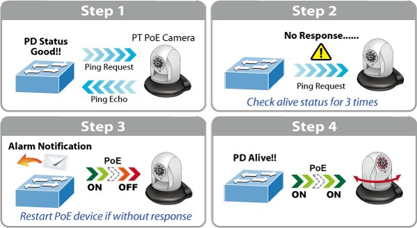 The IGS-4215-4P4T can be configured to monitor connected PD (Powered Device) status in real time via ping action. Once the PD stops working and responding, the IGS-4215-4P4T will resume the PoE port power and bring the PD back to work. It will greatly enhance the network reliability through the PoE port resetting the PD’s power source and reducing administrator management burden.