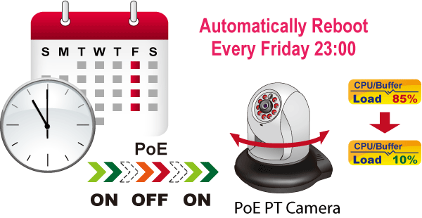 The IGS-4215-4P4T allows each of the connected PoE IP cameras or PoE wireless access points to reboot at a specific time each week. Therefore, it will reduce the chance of IP camera or AP crash resulting from buffer overflow.