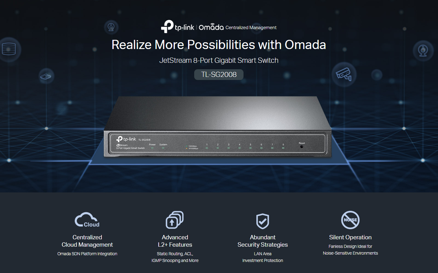 Integrated into Omada SDN: Zero-Touch Provisioning*, Centralized Cloud Management, and Intelligent Monitoring.
