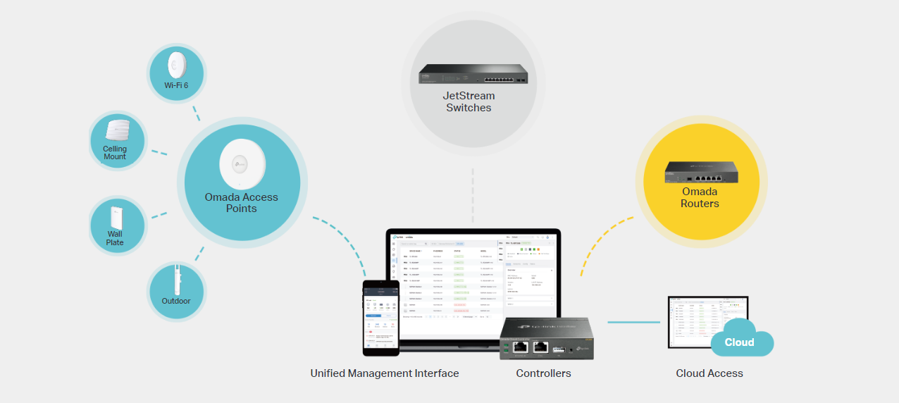 Omada’s Software Defined Networking (SDN) platform integrates network devices, including access points, switches and gateways, providing 100% centralized cloud management. Omada creates a highly scalable network—all controlled from a single interface. Seamless wireless and wired connections are provided, ideal for use in hospitality, education, retail, offices, and more.