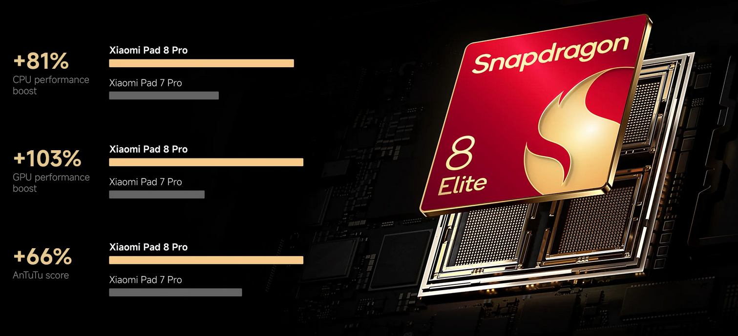 Xiaomi Pad 8 Pro is powered by the Snapdragon 8 Elite Mobile Platform. Built on TSMC’s 2nd-Gen 3nm process and featuring Qualcomm’s dual prime-core architecture, it delivers a dramatic performance leap for PC-level capabilities - effortlessly handling complex multitasking, massive data and graphically intensive games.