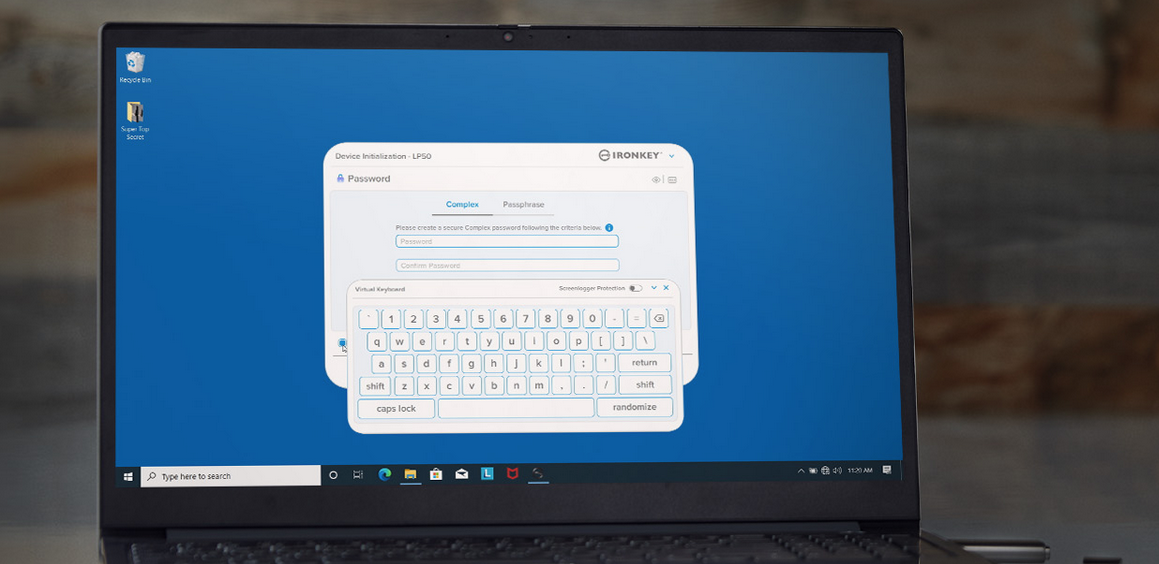 LP50 now supports multi-password (Admin and User) option with Complex or Passphrase modes. Complex mode allows for passwords from 6-16 characters using 3 out of 4 character sets. New passphrase mode allows for a numeric PIN, sentence, list of words or even lyrics from 10 to 64 characters long. Admin can enable a User password, or reset the User password to restore access to data. To aid in password entry, the “eye” symbol can be enabled to reveal the typed in password, reducing typos leading to failed login attempts. Brute Force attack protection locks out User upon 10 invalid password entries in a row and crypto-erases the drive if the Admin password is entered incorrectly 10 times in a row. Additionally, a built-in virtual keyboard shields passwords from keyloggers or screenloggers.